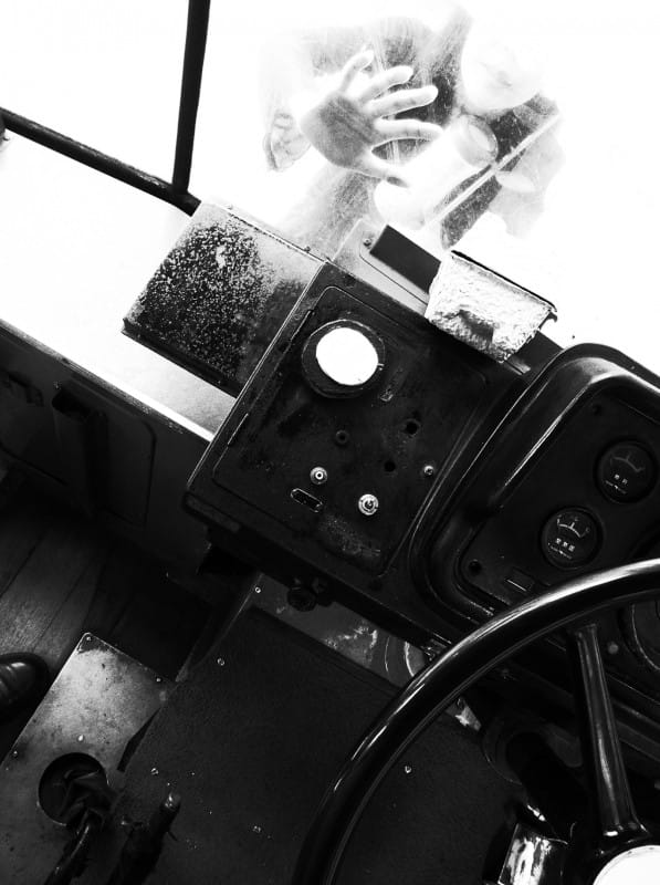 Each of the black-and-white images in this series picks up on some aspect of these two framing images. Thus O Mapa 11168 gives us another perspective from the pavement, with the parasol dramatically overexposed, while O Mapa 11327 returns to the cab of the bus, focusing on the steering wheel and the bottle of Black rum, but also including a hand and a bare foot inside the cab: there is no trace of the woman outside at all in this image. O Mapa 11225 provides another view from inside the bus, but this time the woman seems to be approaching the windshield of the bus, her face hidden by the parasol and her right hand holding an insulated cup in front of the egg-crate on the dashboard.