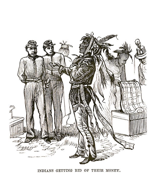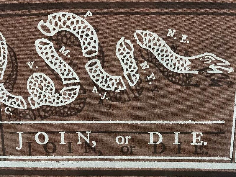 The cartoon itself has most recently been utilized by soccer teams, tattoo parlors, video games and popular television dramas, and it may be these references that the viewer is striving to place in their mind. Its origins, however, lie with Benjamin Franklin’s use of it as a political cartoon in his newspaper The Pennsylvania Gazette, in 1794. At the time, it was a comment on the urgency of colonial unity, as is evidenced by the initials of the colony names shown in the segments of the snake. There was a prevailing superstition that a snake which had been cut up into pieces could resurrect as one again if its disjointed pieces were put back together before sunset. In Jones’s re-appropriation, it becomes rich with competing meanings and readings: it could be interpreted as a dire warning to native peoples regarding the necessity of independently sovereign tribes to unite; it could even simultaneously be referring to the metamorphosis of a newly formed nation of white European immigrants uniting in their increasing aggression and overreach in seizing lands and resources of American Indians via the fervent embrace of the notions of Manifest Destiny, which was being widely propagated during the period of Reconstruction and the Westward Expansion.