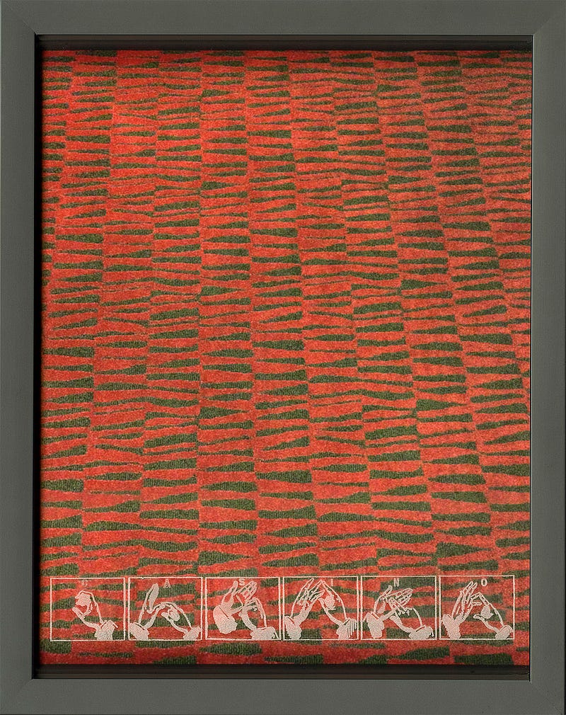 One particularly striking diptych shows a carpet sporting a bright 1970's-era pot-roast color scheme of greens, yellows, browns and oranges. The psychedelic patterning undulates in a design that would not be out of place in a pair of period bell-bottoms. It’s also reminiscent of the nested organic shapes that occur when a rock is thrown into a body of still water, with a tight nucleus reverberating out into wide arcs. Adjacent to this cheery abstraction is an etching of a cartoon woodcut of a segmented snake, with an austere caption beneath which reads: “JOIN OR DIE.” Immediately the viewer is struck with the sensation that they have seen this drawing before, but they do not remember where. And simultaneous to this is the recognition that one’s first-pass reading of the carpet image is changed radically by its pairing with its fraternal twin.
