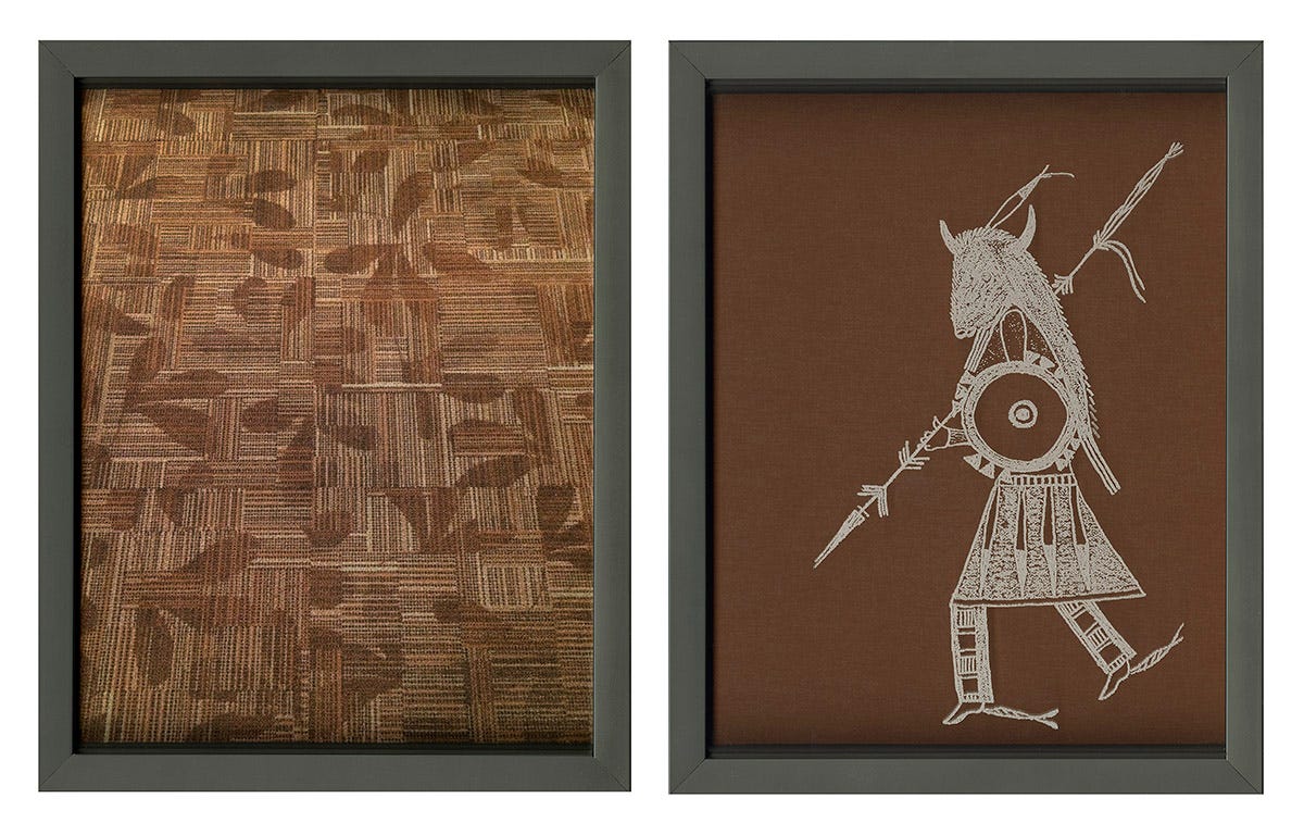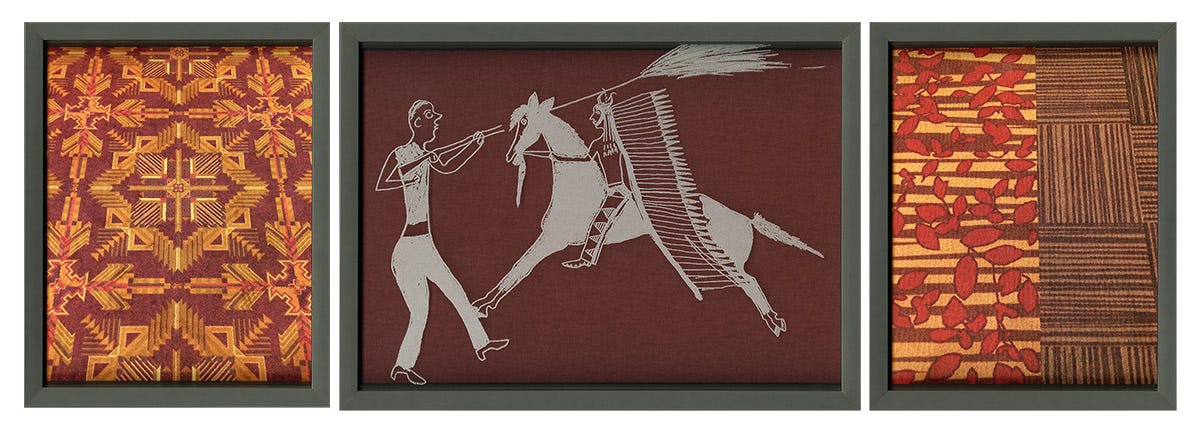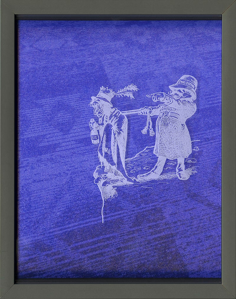 Rival meanings and multiple intended audiences are a sophisticated hallmark of Jones’s work, and especially prevalent in Remnants. This is readily understood even in the consideration of the series title: the OED reveals the word to mean all of the following: “a small remaining quantity of something,” “a surviving trace,” or “A part or quantity that is left after the greater part has been used, removed, or destroyed.” In his use of them, the etchings themselves become a “remnant” — a literal trace of the racist, America-first, genocidal and xenophobic past-that-still-exists-in-the-present regarding the legacy of our post-colonial thinking. The etchings become a ghost or a vesper hovering just above the surface of things historic but also of the mundane and of the now. At times they are very visibly perceptible and at others they seem to literally blend into the carpet’s background, as in “They Watched Over Us,” or “Civilized.”