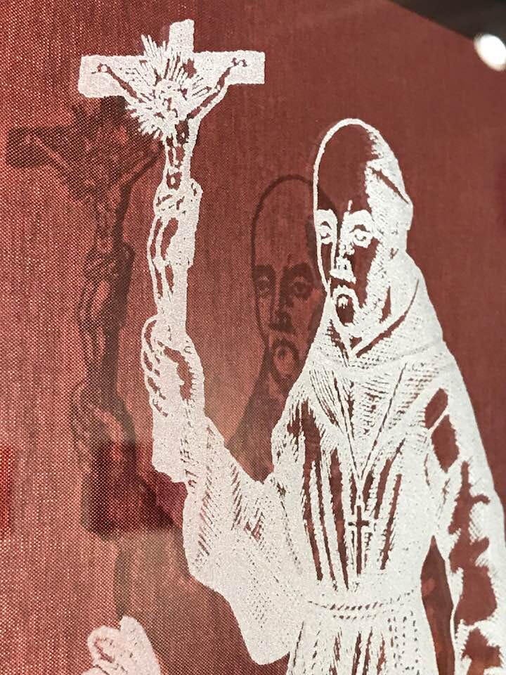 For this latest series, Jones has visited over 100 native casinos from Wisconsin to Texas, photographing the designs of the carpets in these spaces, and then pairing these in a display with an etching on glass of a historical illustration. The source for the etchings range from 19th century weekly newspapers such as Harper’s Weekly, 16th century engravings of European expeditions to the Americas and postcards from the late 1800s or early 20th century; images which Jones has encountered in the course of his research or his travels. As is typical of much of his work, the etchings do not speak to a single point-of-view, but range over a dense terrain of influences, events and perceptions over time as experienced by both American Indians and non-natives: Spanish conquistadors and the subsequent tyrannical agenda of religious conversion; political newspaper cartoons either sympathizing or satirizing events involving American Indians, or historical engravings striving for accuracy of depiction in rendering costuming or rituals. The tone of these range from jocular, to racist, to matter-of-fact: this happened in this way, and sometimes all three at once.