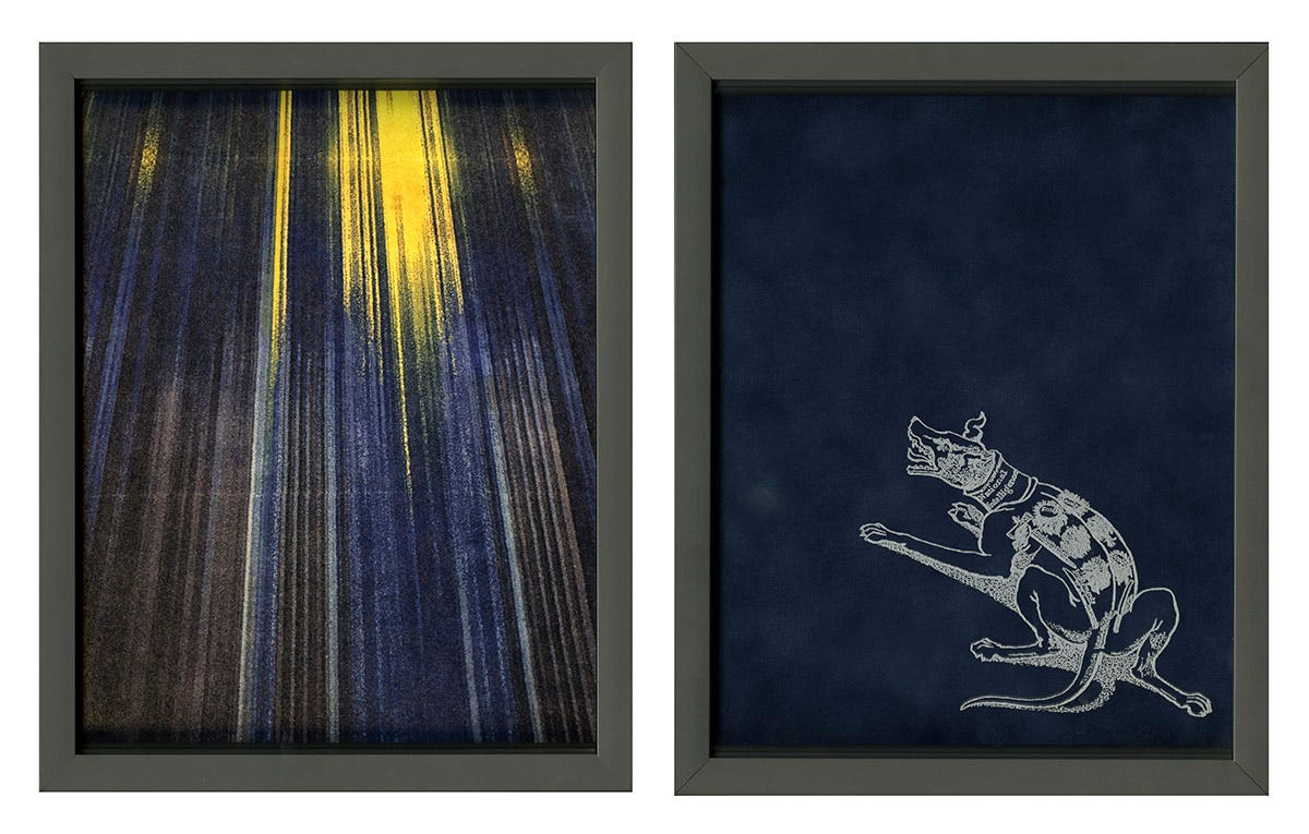 Beyond the literal scratching of image onto glass, Jones is interested in another kind of trace: the shadows cast from the etching onto the linen or velvet backing in the frame. With careful lighting, the shadows on the glass become a reification of this idea of a remnant, literally: a trace upon a trace. Lastly, the perspective shifts that Jones employs stylistically here creates one last layer of significance: the etchings paired with or even on top of the carpets create the reading of the background as foreground and the foreground as background; implying that each share prominence and contribute something vital to the understanding of the other. Meaning woven into meaning; the parts combining to make something other than the whole.