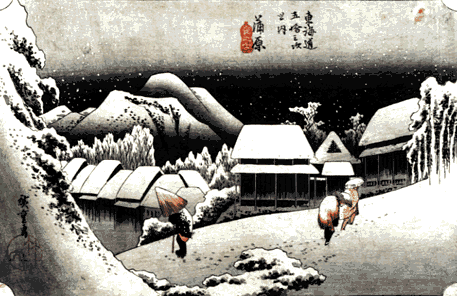©Ando Hiroshige. Night Snow at Kanbara, #16 in the series of 53 Stations of the Tokaido