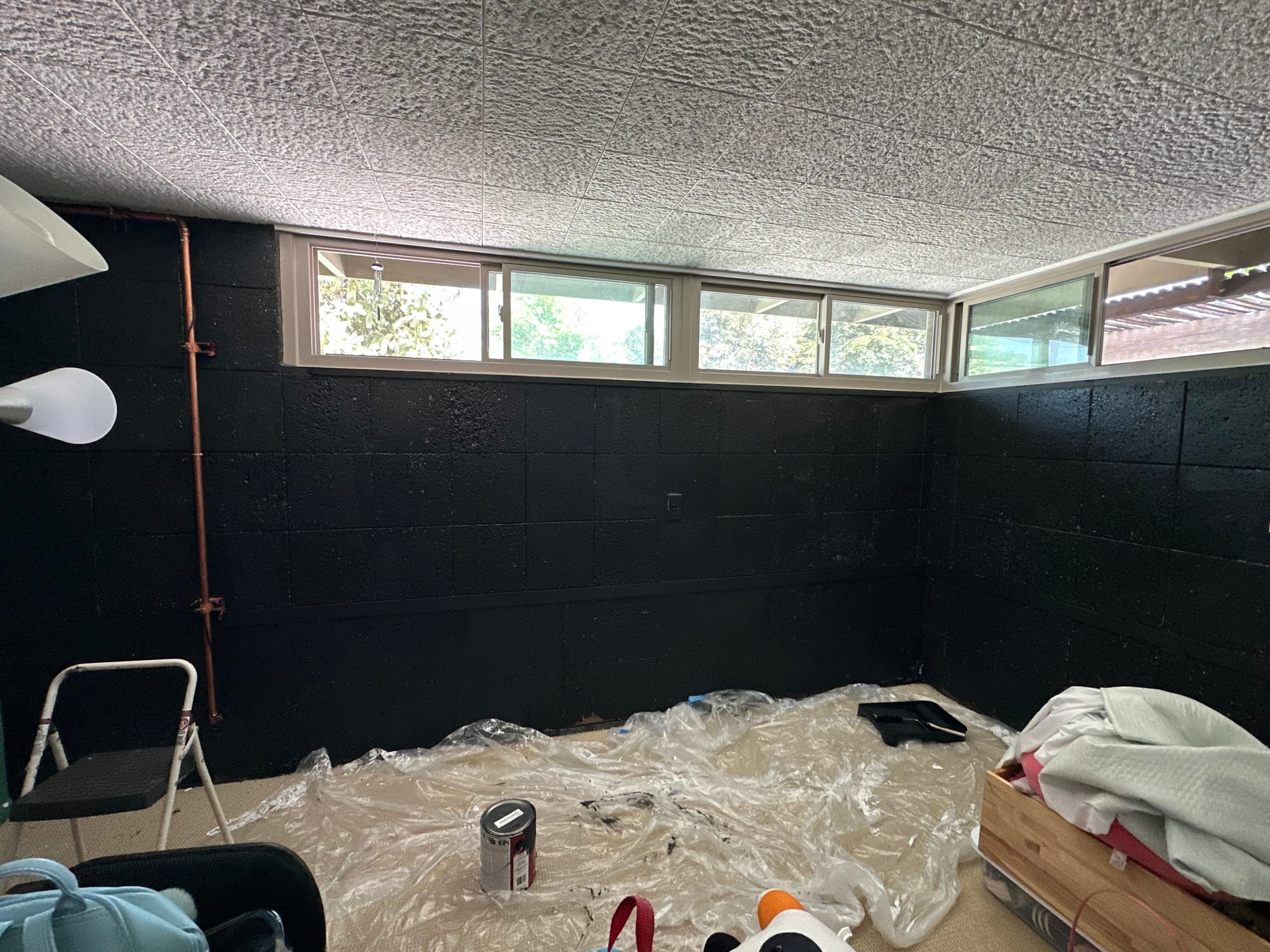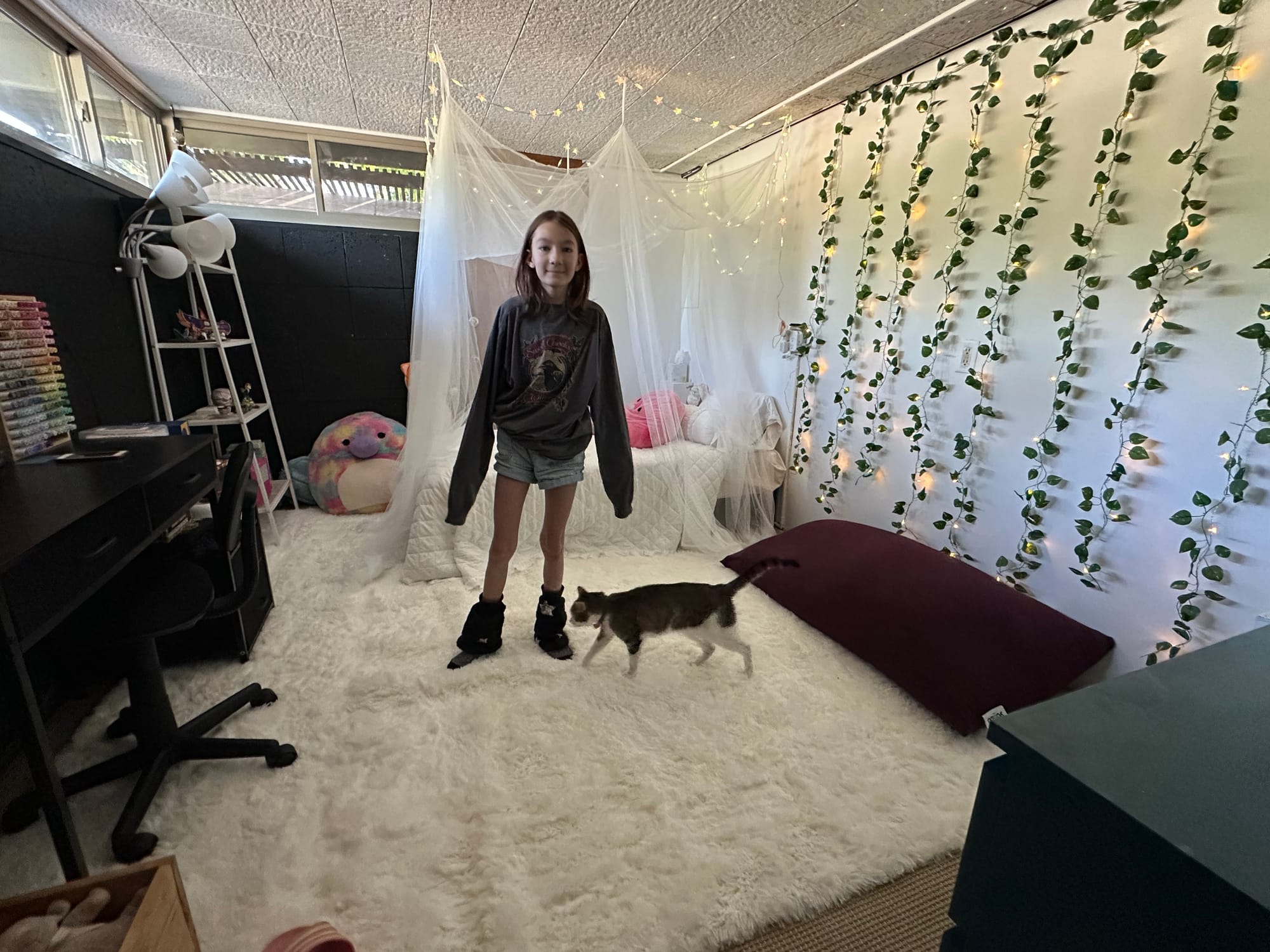 We went with Tomcat "black" (I want to be the person that names paint colors!); cork painted to now resemble a dive bar; almost-twelve-year-old in her transformed space with cat and 1000 less squashmallows.