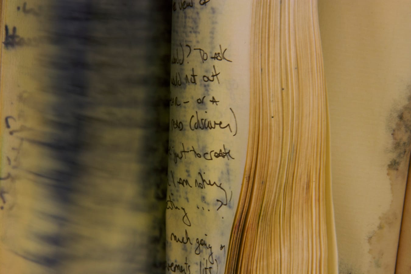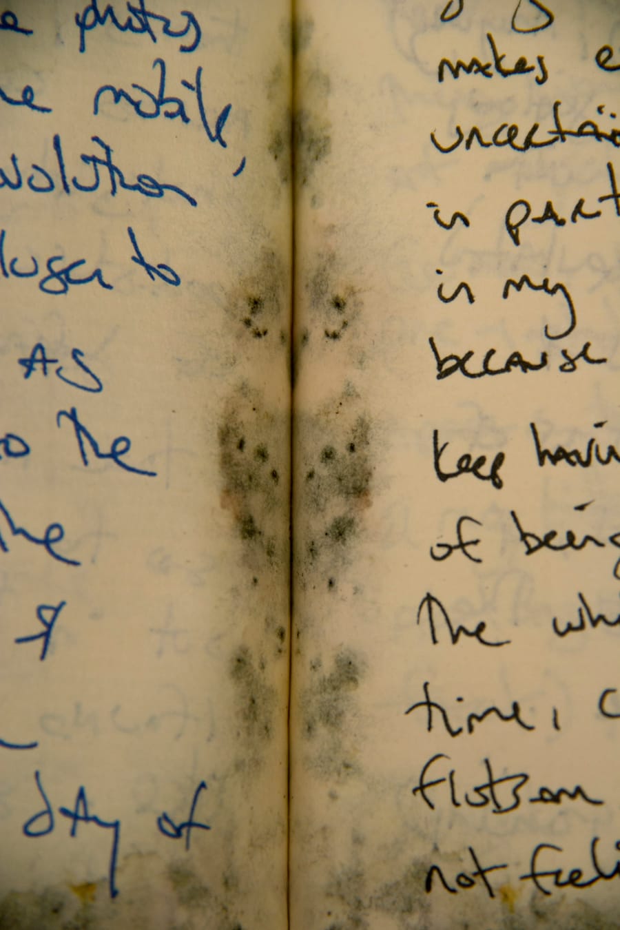 If I ever thought about what might happen to these journals, it was always something mundane: my daughter would get them at some point, or, in a pleasant anonymous fantasy: they would be found at an estate sale or thrift store, and sifted through and wondered about by strangers. Instead, the flood has answered this question with emphatic disregard for any desired outcomes. It has rendered the reliquary of my past an offering of object-ness from which to make something else. In making these images, I am offered the opportunity to refashion my past, look at it as a thing-in-itself as opposed to a thing (a life) that happened to me, make peace with it, and then be granted permission to tear all the pages out, and allow them to continue to deteriorate.