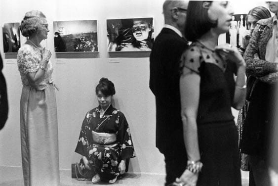 The body of photographs I've seen of Yoko show a multiplicity of moods, filled with both surface and subverted meaning. there are playful, joyous photographs, such as the first one above; sardonic commentary concerning perception, as in the second (the photo shows Yoko dressed in formal kimono, kneeling beneath photographs of herself at the opening of John Szarkowski's curated show at MOMA in 1974 of New Japanese Photography, totally and utterly ignored by the hoi polloi coming to mingle around images made of her by her husband, whom the show, in part, is celebrating); and still there are those posed, Mastubara Apartment, which for all its premeditation, probably says more about power and projection than even Fukase could have imagined when composing it.