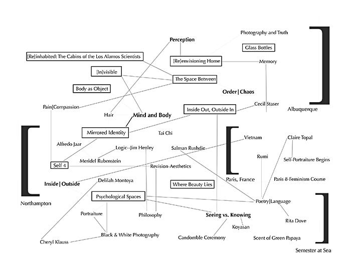 The best assignment I’ve ever been given was during an MFA photography seminar with Patrick Nagatani at the University of New Mexico. He asked everyone in the class to map the evolution of their work — not only what they created but inspirations (from all disciplines) — in a visual manner. The results were visually diverse and personally rewarding. I remember someone created an image of a river with the confluence of various water sources comprising their influences. I created a kind of star chart to map the connections among bodies of work and sources of inspiration. The project left everyone inspired and with a better understanding of how they work and build meaning.