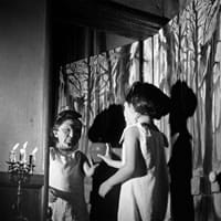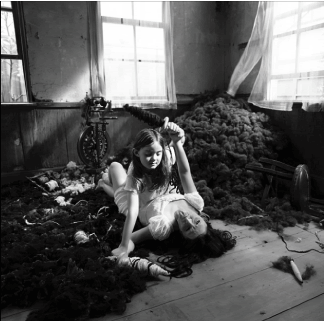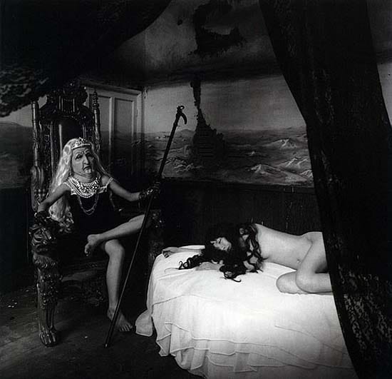 her newest body of work, the darkness of girlhood and the lightness of aging, begun in 2004, picks up some of the more sinister strands that her previous works had flirted with, but had not fully given voice to. to my eye, it is her most darkly compelling and aesthetically full-rounded work to date. in all her previous images, the final product is presented in lush, large, and luminous display, some photographs reaching 70x280" in size. heavily digitally manipulated, extroidinarily detailed, we are engulfed as viewers into her mise-en-scéne. these new images are smaller (but not small, exactly, measuring about 40x40"), classically printed black-and-whites, and still deal with a female-to-female dynamic, but in the well-known terrain of the fairy-tale.