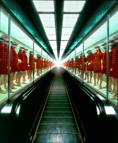 ...wear beautiful uniforms called "royal fashion," often created by famous designers, and they receive special training where they learn to bow and speak with an exaggeratedly feminine tone of voice: "welcome to our department store. we appreciate your visit here today. this elevator is going up now and stops at all the floors upon your request. the second floor is for designer brand dresses for ladies. are there any customers who would like to stop here?" when the door opens, she says, "please mind your step." another elevator girl is usually standing outside the door, also wearing royal fashion. the elevator girl inside the elevator smiles and bows to the girl outside, as if saying, "i am handing over my customers to you, please take care of them." elevator girls stay in their tiny cells repeating the same speech and gestures hour after hour. only beautiful young girls are hired for these positions. for the previous generation, this was a highly desirable job.without this information all i saw were sleek, surreal examples of consumer culture, and was completely oblivious to the specific critique on that culture the images were made to provoke. as i read in interviews and articles, i began to glean that this first work was possibly not meant for a wider cultural audience than the japanese (though her successive work would contend mightily with more collective themes), and that what it would become was yanagi's first stab at puncturing this feminine bubble that exists in japan, the one that sets out all the acceptable options for a woman's course in life and what her expectations can and should be for the duration.