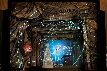 ...I'm playing with three sets of associations in Black Box. The first is the black box of the theatre. The installation consists of a model of a theatre, which houses projections and characters. The characters are small automatons--mechanized (and not necessarily anthropomorphic) objects that perform, together with the projections, within the theatre space. So the first reference is to the "black box" of the performance realm.