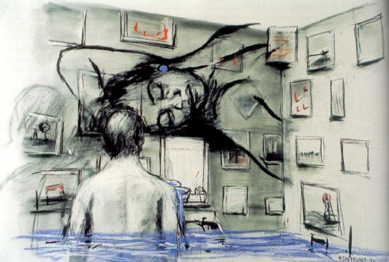 bh: I grew up in a small Southern town where there were certain places black folks couldn't go. in fact, one of the lingering memories of my childhood is of this place that made wonderful hamburgers, but we knew black people would not be served there. and when we walked by as children, those burgers smelled so delicious, and the smell awakened longing, but as a black person you could not satisfy this desire. what's interesting about the u.s. is, people have so quickly forgotten the intensity of that legislated apartheid here.wk: that forgetting is already happening in South Africa, too. the system in South Africa is only four or five years old, and memory is gone. In many cases, it's already difficult to hang on to what we were. there is sort of a willful amnesia, a refusal to accept accountability, that comes from the naturalization of outrageous systems in the world. but i'm more interested in the question of historical memory--of what happens when people forget so quickly. bh: an intriguing aspect of your work is its immediacy: you use popular forms--cartoons or poster graphics--and defamiliarize them. at the same time the pain is more accessible. it becomes an intimate trauma. in the installation ubu tells the truth, a narrative of daily life unfolds that is ordinary and mundane, and then suddenly traumatic events happen, transforming the experience.wk: a question i eventually ask is, how does one relate a private experience of a public trauma? for example, when we see images on television now, of people killed or starving, it's not that they aren't shocking, but that they fit into a sort of bank of images and are dulled. the hard part is to try to get back to the first sense of shock one had...the hard part is to try to hold onto that sense of outrage because that is the truest response. all the other ways of living with it dilute and normalize.bh: a willingness to receive the truth of images has to be there as well. when i read about your childhood it was evident that actually witnessing cruel acts gave you a heightened sense of awareness. lots of other little white boys saw these things. what enables one person to resist while many other people collude?wk: a whole constellation of facts. for me it actually has to do with the house i grew up in. i was raised to be aware of the nature of the society we were living in. kids i went to school with grew up in a world where hatred and terror were normalized. what are the things with which people blinded themselves to find all that acceptable?bh: they have to construct a wall inside. your work exposes the layers of these walls. for example, there is a recurring image of someone turning their back. whether you are white or black, the demand of white supremacy and apartheid is always that one split oneself--to normalize. a white person like you, who resisted normalization, stands out.wk: i always assumed that splitting was just the way one exists in the world.something bell hooks says about kentridge in the preface to her interview sticks. she says that kentridge is always "...acknowledging that we are always more than our pain." a major--and moving--theme of black box has to do with what one does with such pain. the narrator megaphone man rolls out into the stage area, with a torn-sheet placard affixed to it reading trauerarbeit.