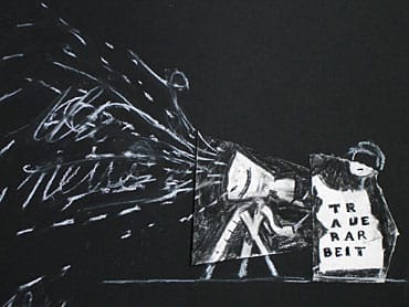 the word refers to freud's conception of grief work, conceived of as a necessary labor, a mourning one undergoes which has a finite endpoint (mourning and melancholia, 1917). with the introduction of this word and, indirectly, this historical peer working on these themes at the time of the massacre, kentridge opens up a dialog about what it is to be guilty, to be complicit, to be the inheritors of psychic pain. maria-christina villaseñor, the curator of black box, wrote that among kentridge's questions are: